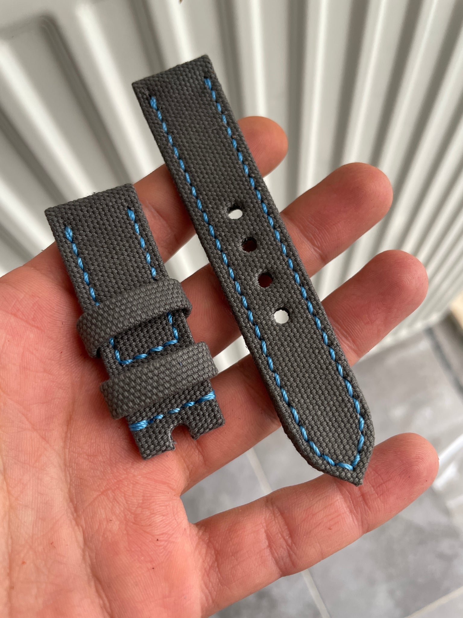 Ready for shipping,we can add buckle if requested.Rollled edge,resistant to water,doesn’t include leather as inner layer.Made using 100% cotton Canvas fabric.