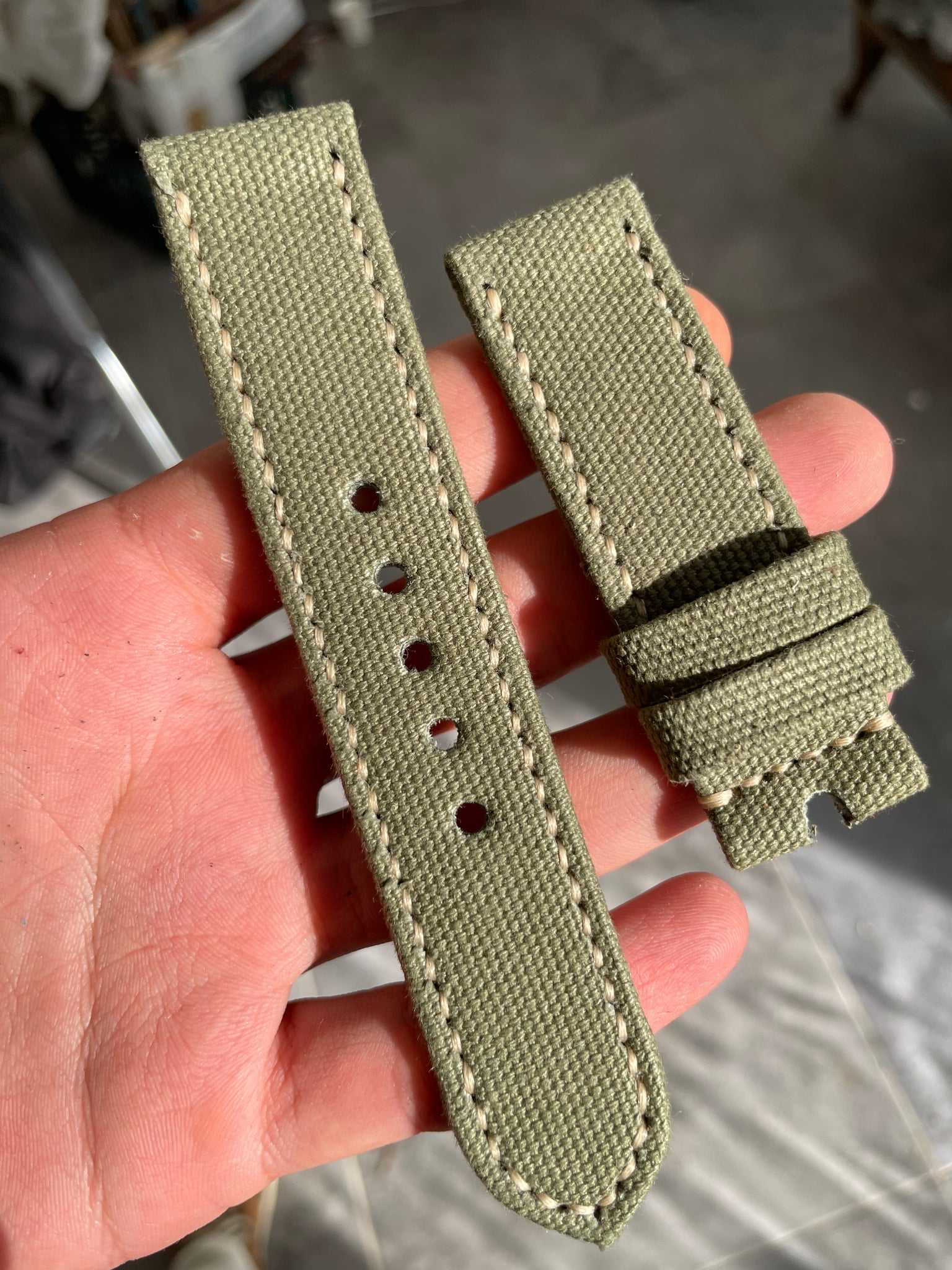 Ready for shipping,we can add buckle if requested.Rollled edge,resistant to water,doesn’t include leather as inner layer.Made using 100% cotton Canvas fabric.